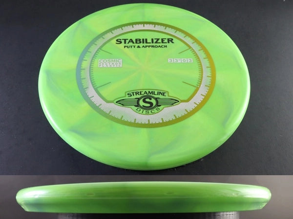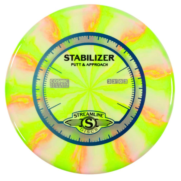 The Stabilizer provides rock-solid consistency — a disc you can trust for headwind putts, forceful approaches, and accurate hyzers. In Cosmic Neutron SL plastic, it gains lighter-weight glide, a premium feel, and standout swirled aesthetics, making it both functional and visually stunning. When you need reliability above all else, the Stabilizer delivers.