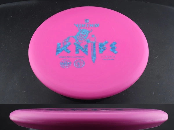 The Viking Knife putt & approach disc is slightly overstable and can handle a lot of power. The rim is designed to be comfortable with backhand throws using both a power and fan grip. It is a beadless putter with a blunt rounded feel.