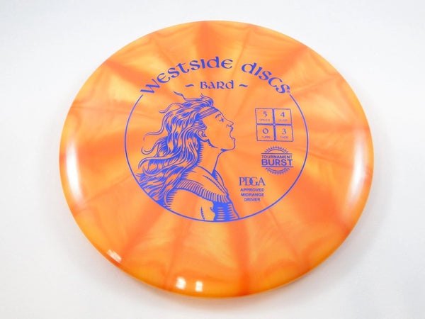 The Westside Bard in Tournament Burst plastic is an overstable midrange crafted for players who want dependable fade, torque resistance, and a premium feel in the hand. Known for its flat top and consistent overstability, the Bard excels at controlled approaches, forced hyzers, and forehand shots that require a disc to hold firm under power. The Tournament Burst blend offers a grippy, flexible premium feel with eye-catching swirl patterns, giving throwers both comfort and durability in all conditions.