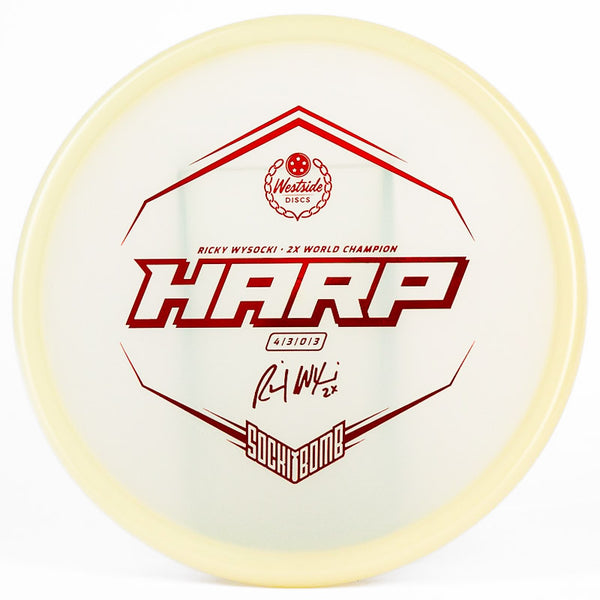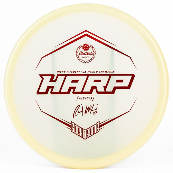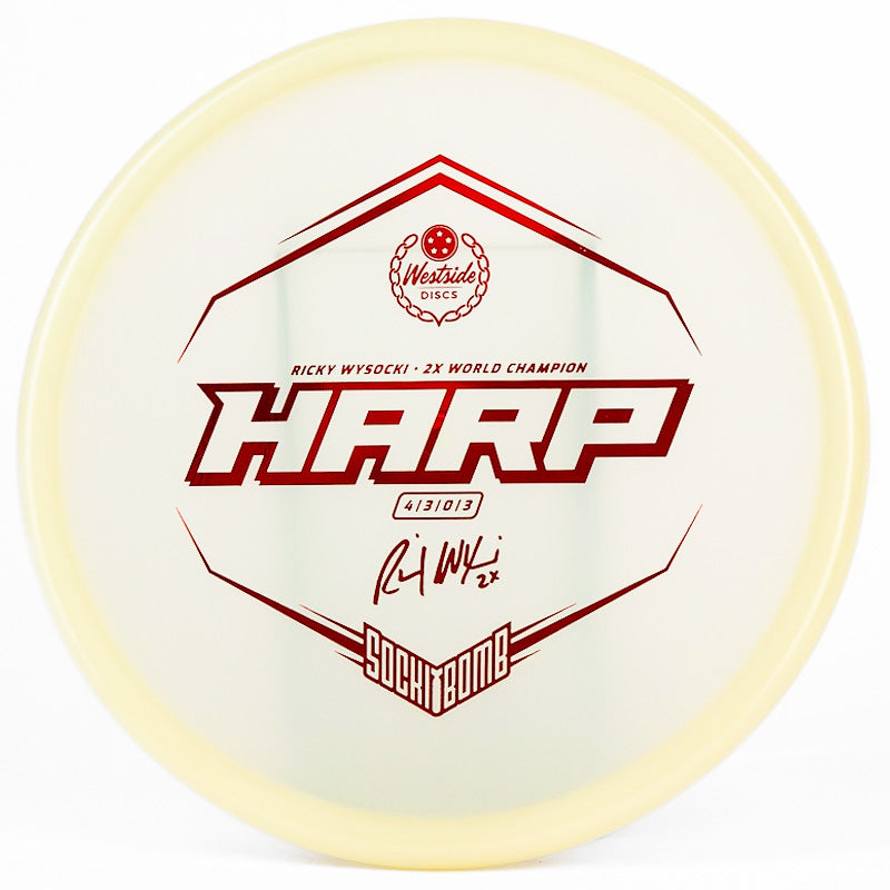 The Westside Discs Moonshine Glow Ricky Wysocki Harp is a bright glow in the dark overstable disc golf approach disc. Westside's Moonshine plastic is probably the grippiest glow plastics I have ever thrown, and holds its glow charge for quite awhile before dimming out.