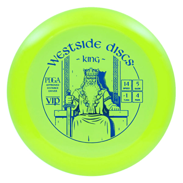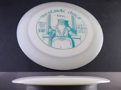 In VIP plastic, the King delivers a high-glide, workable distance flight with a touch of high-speed turn followed by a dependable fade. Players with slower arm speeds can expect easy hyzer-flips and long drifting shots, while power throwers will see long flex lines that finish reliably. Its glide makes it especially effective for big open-field throws or tailwind bombs.